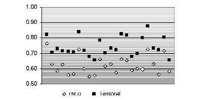 La homogeneización de las variables del idh-pnud, no sólo en términos desagregados sino incluso cuando se comparan los totales nacionales para diferentes países, ha sido señalada por autores como Kelley (1991) y Qizilbash (2002). La metodología propuesta por el pnud resulta más adecuada para discriminar la situación de los países que arrojan valores del idh bajos que la de aquéllos que presentan valores medios o altos.[2] Estas apreciaciones se ilustran por medio del análisis de variabilidad.[3]