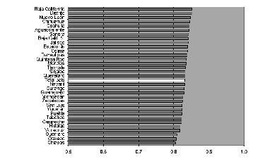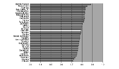 Un panorama marcadamente distinto se configura en países como Brasil y México que, según la clasificación del pnud, arrojan un nivel de desarrollo humano inferior al de Chile y Argentina. En las series de datos obtenidas, la desviación estándar de la tasa de alfabetización de adultos alcanzaba 8.6 en Brasil y 4.8 en México. En el primer caso, la medida indica la alta heterogeneidad con que se distribuye la alfabetización entre los estados. Para el año 2003 el indicador registraba un valor nacional de 88.4%, y valores extremos de 71.6 y 95%. En México, que presentaba en 2004 una tasa de alfabetización de 91.5%, los valores mínimo y máximo a nivel estadual fueron de 81.2 y 98.2 por ciento.