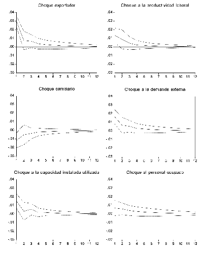 La ecuación (1) se estima en forma de regresión múltiple para, posteriormente, proceder a corregir eventuales problemas de sobreespecificación o subespecificación. Asimismo, se estima un modelo var generalizado para determinar si el análisis dinámico (es decir, las funciones de impulso-respuesta) es consistente con el análisis estático (es decir, con las elasticidades). Mediante el empleo de dos técnicas econométricas se tendrán diferentes perspectivas sobre la respuesta de las exportaciones manufactureras frente a incrementos en algunos de sus determinantes básicos: la productividad laboral, el tipo de cambio real y la demanda externa de exportaciones, entre otros.