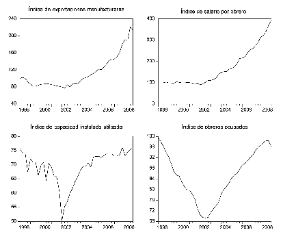 [8] Ésta es una buena proxy para la demanda externa de manufacturas mexicanas, toda vez que Estados Unidos es el principal destino de exportación de México. En el año 2007, por ejemplo, 84.5% de las exportaciones mexicanas de mercancías se colocaron en ese país. Por otra parte, en el año referido, la participación de las exportaciones mexicanas de bienes en las importaciones de Estados Unidos fue de 10.8%, lo cual coloca a México como el tercer proveedor más importante de mercancías en Estados Unidos después de Canadá y China (Informe Anual del Banco de México, 2007, p. 162).