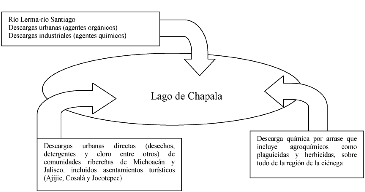 [18] Al respecto, Paré (1989) señala que en el río Santiago, otro de los afluentes importantes de aporte hídrico al lago, 25 empresas vierten discriminadamente sus desechos, entre ellas Celanese, Industrias Ocotlán, Cyba-Geygi, Cyanamid, Productos de Cola, Penwalt e Industrias Petroquímicas Mexicanas, todas ubicadas en el corredor industrial La Barca-El Salto; además el río recibe descargas urbanas de Poncitlán y Ocotlán, Jalisco.