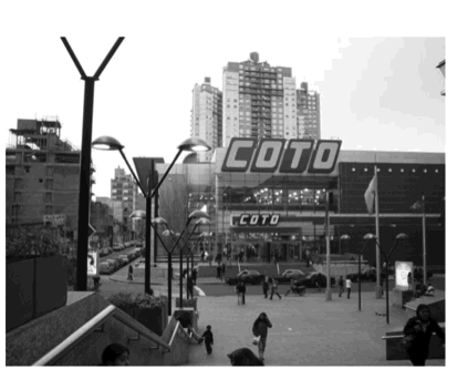 Cuando se construyeron los primeros cuatro pisos de las torres, irsa decidió encarar la tercera intervención urbana en la manzana ubicada entre las ta y el sa. Se trataba de la construcción de un hipermercado que fue vendido a la sociedad Coto cicsa.[24] Al principio se proyectó construir un túnel aéreo que comunicara el hipermercado Coto con el sa. Por medio de un dibujo, El Libro del Abasto muestra que el conducto aéreo efectivamente se montó (figura 5). La ilustración también muestra otra vista panorámica donde éste se interpone de inmediato con dos torres emplazadas en la misma manzana donde funciona el ostentoso centro de compras. A diferencia del túnel, este complejo habitacional que empata en altitud con las torres vecinas y reales, no se menciona en el libro que ovaciona la transformación del barrio realizada por irsa.[25]