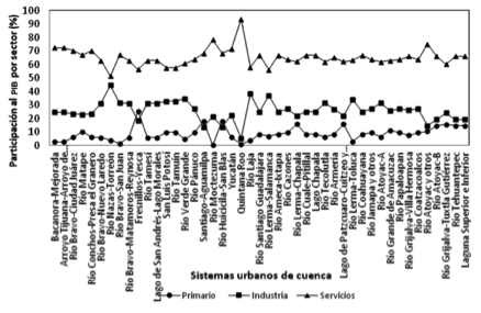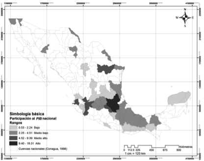 La estructura del análisis responde al siguiente orden: a) de un total de 159 cuencas registradas por la Comisión Nacional del Agua (Conagua, 1998), se consideran 45 debido a que en ellas se genera 92.85% del pib del país, es decir, se elige una muestra donde se concentra la mayor demanda de recursos y se reproduce un creciente estado de vulnerabilidad social; b) se identifican los sectores de la actividad económica predominantes en las cuencas de estudio para estimar la demanda efectiva, y c) se estiman los factores que modifican el sistema hídrico, particularmente la extracción de agua y la sustitución de usos del suelo.