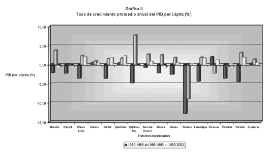 En relación con la gráfica i y ii y de acuerdo con Mendoza y Villena (2006: 582), uno de los factores que explica la desigualdad económica regional en México es la dotación de infraestructura pública. Fuentes y Mendoza [citado en Mendoza y Villena, 2006] señalan que la asignación de dicha infraestructura desempeña un papel importante en las diferencias del pib per cápita, ya que de 1980 a 1985 éste aumentó de manera significativa y apoyó un proceso de convergencia regional. En la etapa 1985-1993 esta variable perdió importancia debido a la disminución de la participación del sector público en la provisión de bienes y servicios.