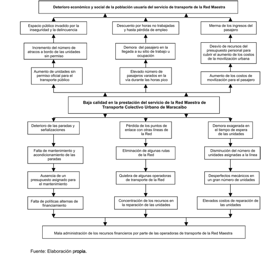 En los últimos años se ha venido observando cómo el sistema de transporte colectivo urbano creado por la municipalidad, denominado Red Maestra de Transporte, ha desmejorado profundamente su servicio al pasajero. Un árbol del problema (figura i) nos permite evidenciar, entre los indicadores de dicha situación, la demora exagerada que sufre el pasajero a la espera de las unidades de transporte, las cuales tardan una media aproximada de 25 minutos en frecuencia de llegada entre una parada y otra.[6] Esto significa que una persona que opte por ese servicio puede perder aproximadamente una hora/hombre en un recorrido de 10 kilómetros, lo cual también puede variar hacia a la baja o, peor aún, incrementarse debido a que no existe un horario establecido de llegada en ninguna de las paradas de las 11 rutas que conforman la Red.
