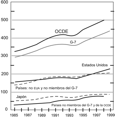 Los antecedentes de todo se encuentran, desde luego, en la curva logarítmica que sirvió como base a Gordon Moore para la formulación de la ley que lleva su nombre (gráfica vi) y en los porcentajes (ya en particular desprendidos de la gráfica iii, de los países más industrializados) en i-d como porcentaje del producto interno bruto respectivos, donde encabeza la lista Japón, seguido por Estados Unidos, Alemania y Francia. Destaca la grave caída de Rusia, que logra recuperarse y ponerse a la par de Italia; en tanto que México, en contraste, no llega a alcanzar en ningún momento ni el uno por ciento (véase gráfica vii).
