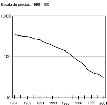 La reducción de los costos de pista vocal, de audio y de video, así como el incremento en la capacidad de conducción de las mismas, han sido determinantes en el expansionismo de las tic y en el control que sobre ellas ejercen las etn. Los precios de las computadoras declinan, parejamente con la inversión en i-d e ide de los monopolios informáticos (véanse gráficas ii a iv). En la gráfica iii en particular podemos apreciar los fuertes desembolsos de los países miembros de la Organización para la Cooperación y el Desarrollo Económico (ocde) y los partícipes del Grupo de los Siete (g-7) como los más representativos de tales incrementos, seguidos por Estados Unidos y Japón, y, al final, los montos erogados por los países no miembros de la ocde y no miembros del g-7. En la gráfica v se puede ver la alta prospectiva de crecimiento hasta el año 2010 de la telefonía móvil, en contraste con la declinación de la fija.