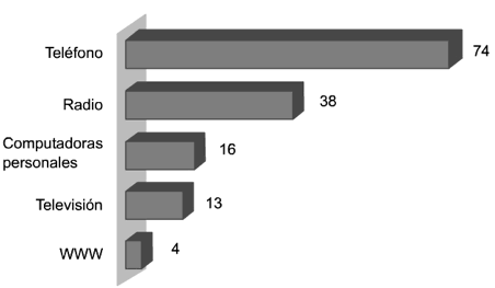 Si se compara el ritmo de difusión de los aparatos más representativos de la Sociedad de la Información, podrá vislumbrarse la capacidad del cambio tecnológico y la innovación a que han llegado las tic. Mientras que al teléfono le llevó 74 años alcanzar los 50 millones de usuarios, en tanto que la radio tuvo que esperar 38 años para alcanzar la misma cifra, a las computadoras personales sólo les llevó 16 años, 13 a la tv, y tan sólo cuatro años a la red de internet (véase gráfica viii). Sus operaciones, convalidando las tendencias de la producción en general, resultan en que: