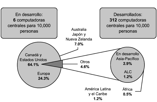 ·       El 96% de las computadoras centrales de internet (cci), se encuentra en los países de alto ingreso, cuya población constituye tan sólo 16% de la población mundial.