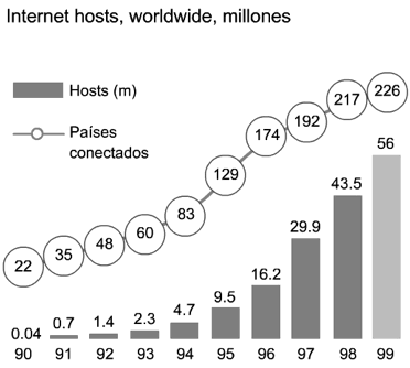 En el entorno mundial, la internet ha sido considerada como una pequeña parte del fenómeno globalizador. La red ha sido incrementada de 213 host de computadora y varios miles de usuarios en agosto de 1981, a más de 56 millones de host de internet hacia julio de 1999 (gráfica xi), soportando un estimado de 190 millones de usuarios de internet. Sin embargo, aún más imprevisible es el número de ciudades conectadas a la red global. Al cerrar el siglo xx en julio de 1999, cerca de 200 países estaban conectados. Las tendencias mostradas en la gráfica véase gráfica vii eran imprevisibles. Un estudio detenido de las cifras de la gráfica xi revela las grandes disparidades de los host de internet entre regiones de alto y bajo ingreso. Por ejemplo, encontramos casi los mismos host en Francia que en toda América Latina y el Caribe. Hay más host en tres países altamente desarrollados de la región Asia-Pacífico (Australia, Japón y Nueva Zelanda) que en otras naciones de la región combinadas, y hay más host en Nueva York que toda África. La mayoría de los host internet están en los países desarrollados, lo que sugiere que una buena salud y una óptima educación son los factores definitorios la difusión de la internet.