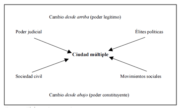 Como se explica en la introducción, el asunto de la democracia ha vuelto a ser puesto en boga dentro de la agenda de la investigación urbana como consecuencia del renovado optimismo que hoy alenta a la comunidad científica. Sin embargo, lo que todavía queda sin ser contestado dentro de la literatura general es la idea de la democracia urbana misma. Mi investigación ha querido ir más allá de la idea generalizada de que las estrategias urbanas tienden a converger hacia un punto de estabilidad en la búsqueda de soluciones consensuales. Por el contrario, he tratado de comprender la complejidad de los procesos contemporáneos del cambio urbano presentando un marco de análisis en dos niveles: desde arriba y desde abajo. El primero se centra en los actores que poseen el ‘poder legítimo’ sobre las ciudades, mientras que el segundo pone atención en la acción de un conjunto de contrafuerzas urbanas que personifican al “poder constituyente” en el ámbito público (Hardt y Negri, 2000).