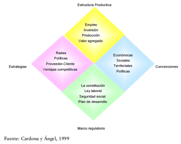 La construcción de los delineamientos para el desarrollo sectorial es un acumulado histórico de conocimientos expresados en los modos de producción, en los resultados del trabajo y en el uso de tecnologías. Aquí se propone considerar cuatro dimensiones en el análisis de la política sectorial (véase el esquema I): La estructura productiva de los sectores, entendida como las condiciones de empleo, inversión, producción y valor agregado; las estrategias de las empresas, en la que se destaca la existencia de redes formales o informales con los proveedores y los clientes; las convenciones[6] como especificidades territoriales en los ámbitos económico, político, ambiental y social; y el marco regulatorio, expresado en la Constitución, la ley laboral, el plan de desarrollo, el plan de ordenamiento territorial y la política industrial.