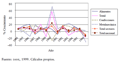 Entre 1992 y 1995, la tasa de crecimiento de la economía colombiana, medida en términos del incremento del pib, mostraba que la evolución del país era sostenida y sólida, registrando niveles superiores a 5% anual (véase la gráfica 1). Sin embargo, durante este periodo la actividad industrial mostró tasas de crecimiento moderadas, debido a la competencia interna que le ha significado la apertura económica (dane, 1999).