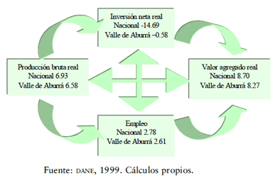 En el territorio se construyen convenciones sociales y económicas que marcan la estructura productiva. En efecto, se observa que el Valle de Aburrá consolida (internaliza) el sector confección, alimentos y metal-mecánico mientras que en el contexto nacional la reconversión tecnológica en estos sectores no se hace evidente en las cifras de la inversión. El esquema 2 recoge las tasas de crecimiento promedio agregadas para los cuatro sectores en el periodo 1983-1996, donde se observa la configuración de relaciones sectoriales en los ámbitos nacional y regional.