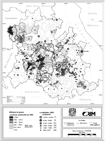 [8] Si se considera solamente el rango uno al que pertenecen seis municipios, la concentración del sector es aún más evidente, dado que en ellos se generó 56% del pib terciario en 1993.