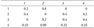 Por otra parte, como lo indica la metodología y las propiedades de las cadenas de Markov, con este instrumento se pueden obtener las probabilidades de transición para cualquier estado en un tiempo futuro; considerando la última matriz 2003-2008 se puede hacer una proyección para el año 2013[8] simplemente elevando al cuadrado los valores de dicha matriz, la cual queda como a continuación se muestra: