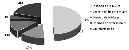 [13] Informes de Instituto Nacional de las Mujeres asientan que a fines del año 2003 funcionaban en el país 32 dependencias estatales y 422 municipales, lo que indica que la réplica en el ámbito municipal siguió un ritmo más lento (Inmujeres, 2005 y 2009).