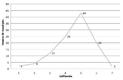 [27] Las calificaciones obtenidas fueron el resultado de otorgar un valor numérico a las respuestas de cada una de las preguntas, a partir de criterios óptimos de suficiencia, disminuyendo la calificación en la medida que la respuesta se aleja del óptimo estimado en rangos de 10 a cero. Dicha escala se aplicó a todas las preguntas evaluadas para obtener el perfil de capacidades de cada municipio.
