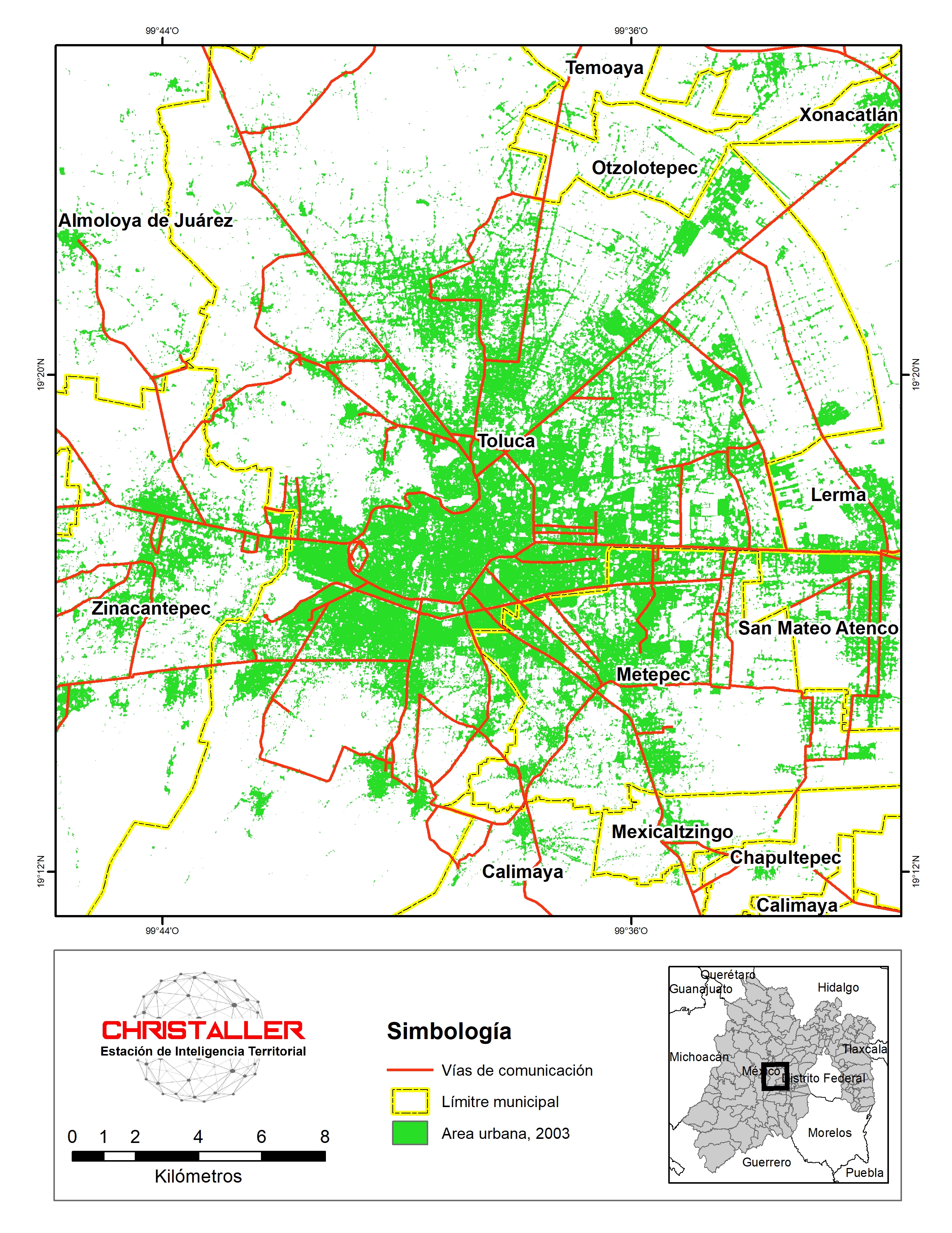 Sudhira, H. S.; T. V. Ramachandra y K. S. Jagadish (2004), “Urban sprawl: Metrics, dynamics and modelling using GIS”, International Jour- nal of Applied Earth Observation and Geoinformation, 5 (1), Elsevier, Ámsterdam, Holanda, pp. 29-39.